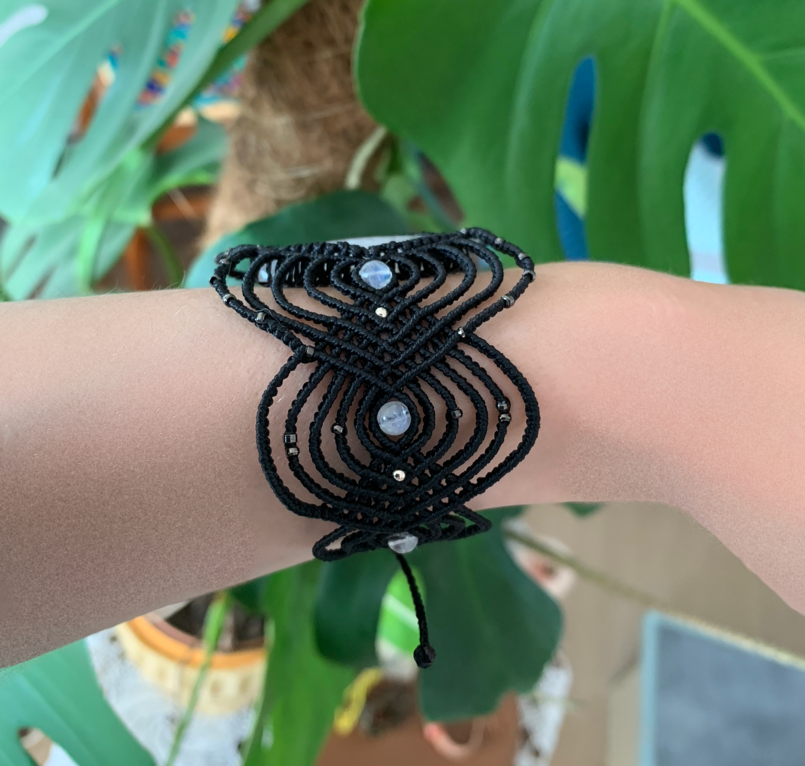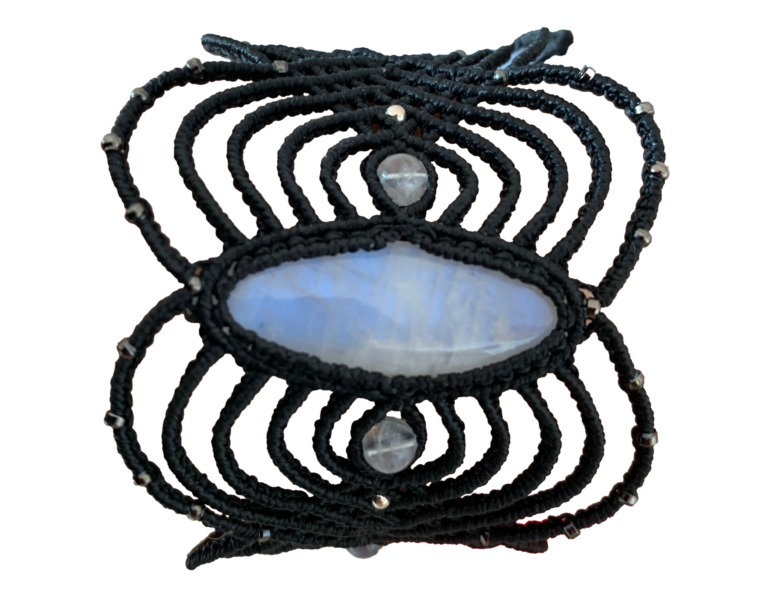Bracelet en fils très fins avec pierre de lune centrale aux beaux reflets bleu.